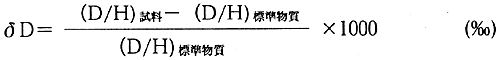 ここで、(18O/16O)および(D/H)は、それぞれ18Oと16OおよびDとHの濃度比をあらわす。通常、標準物質としては、標準平均海水(Standard Mean Oceanic Water)が用いられ、SMOWと略記される。