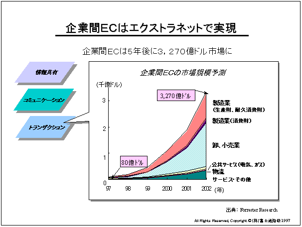 トランザクションは、言葉をかえると、インターネットにおける企業間EC(電子商取引)ということができる。つまり、インターネットを使って企業間で物やサービスを取引することである。ECというと、これまで一般消費者を対象とするEC(BtoC)が主にクローズアップされてきた。しかし、最近、企業を相手にする企業間EC(BtoB)のほうが実は本命で、今後は取引額も桁外れに急成長を遂げるといわれている。フォレスター・リサーチによれば、インターネットにおける企業間ECの市場規模は、97年で80億ドル、5年後の2002年には3+270億ドルに達するといわれている。もちろん、この中には、特定企業とではなく、インターネットのオープンな環境下で不特定多数の企業と取引するケース(例えば、オークション、入札など)も含まれる。しかし、実際のところ、全く取引を行ったことのない企業同志がネット上でいきなり取引を始めるのは難しく、大部分は、既に信用関係を築いている企業同志がエクストラネットを通じてECを行っていく形態が主流となると考えられる。従って将来、企業間EC市場がこれだけの急成長を遂げるとすれば、エクストラネットは今後、企業活動において非常に重要なインフラとなると言える。