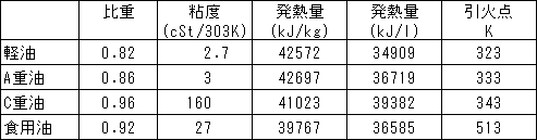 廃食用油をディーゼルエンジンの燃料として用いる為の基礎物性を調査した。天麩羅油はCnH2n-1−COOH,CnH2n-3−COOH、n=17を多く含む植物油脂で物性を表-1に示す。発熱量としては軽油、重油等の燃料に比べて単位重量あたりでは3〜6%少ないが比重が大きいため単位体積あたりでは軽油に対し5%多く、A重油とほぼ同等、C重油に対しては8%少ない。即ち、軽油、重油等と同一出力を出す場合の体積燃料流量はほぼ同量であるので燃料タンクの容量を変える必要が無い事がわかる。