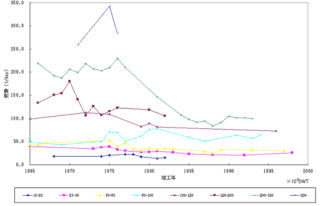船型ごとに一日当たりの速度補正後の燃料消費量の平均値を示した。ULCCから船型が小さくなるに従い、新造時の一日当たりの燃料消費量は低下している。また、竣工年が新しくなるに従って、燃料消費量は減少する。VLCCクラス(図中+)では、おおよそ半分にまで減少している。