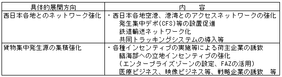 アジアの主たるハブ港湾等との競争に対してはコスト面よりもサービス面での強化を図るべく機能の充実を図る。24時間化、情報化、自動・機械化、高速化等のサービスの向上を図る(データキャリアの導入、規制緩和のモデル地域化等)。また、ベイエリア地域内の空港、港湾との機能分担の強化、西日本各地の空港、港湾との連携強化等を進める(各空港方面別共同配送トラッキングシステム、共通のカーゴコミュニティサービスの導入、空コンテナの西日本での流通市場等)。既に、阪神港と地方港との連携は大手船社等が地方港にオフドックCFSを開設などして実施している(地方地域からの集荷を強化するため、地方港近隣にオフドックCFSを設置し、空コンテナの搬入を阪神港ではなく、地方港までとしている)。同様に地方空港においても、拠点空港までの共同物流を実施しているところもある(仙台空港と成田空港)。このような試みを地方空港、港とともに積極的に図っていく。