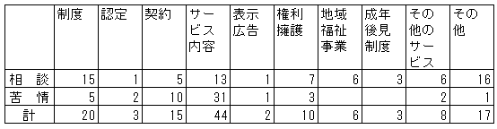 また、主な相談・苦情の内容は、次表にみるように「サービス内容」に関する相談(44件)、「制度」に関する相談(20件)、「契約」に関する相談(15件)、「権利擁護」に関する相談(10件)、となっている(表II1-(2)を参照)。