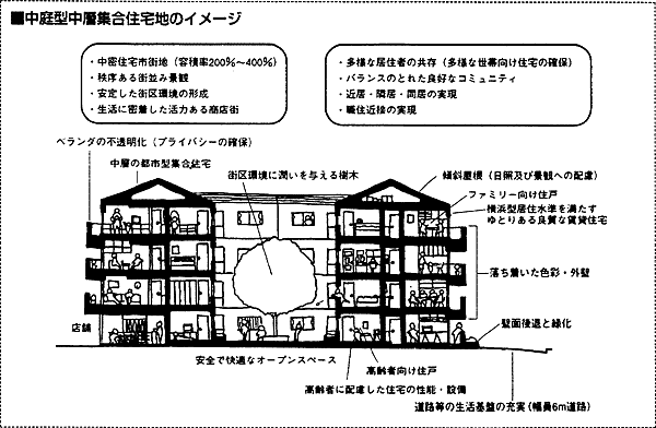 ・建替の際には共同化、協調化を誘導し、オープンスペースや緑化空間等の確保を図る。また、狭あい道路の拡幅整備を促進する。