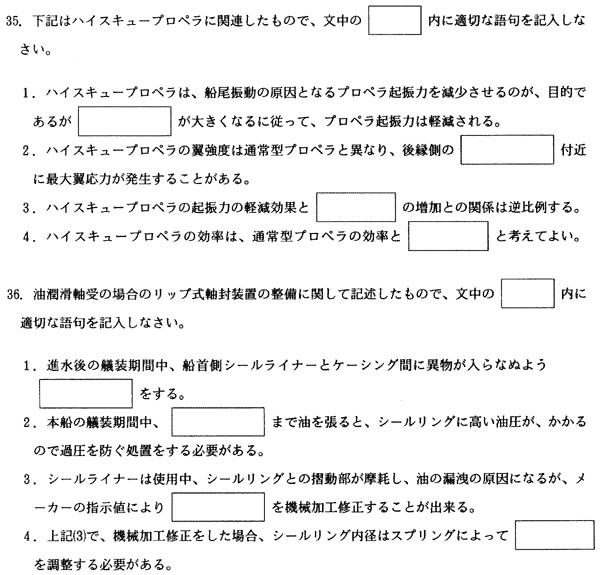 ( ) 4. 就航中、リグナムバイタ軸受が摩耗した場合、軸受すきまの摩耗限度については、特に船舶機関規則に定められていないので、検査官に報告する必要はない。