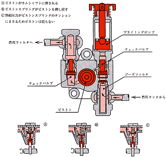 燃料供給ポンプは一部の小形機関を除き殆んどの機関に設けられ、燃料供給を確実に行わしめるためのものであり、フィードポンプとも呼ばれている。一般に最も多く用いられているフィードポンプはボッシュ式燃料フィードポンプであり、それ以外には中大形機関に用いられているトロコイド式やベーン式ポンプなどがある。小形ではダイヤフラム式なども用いられている。
