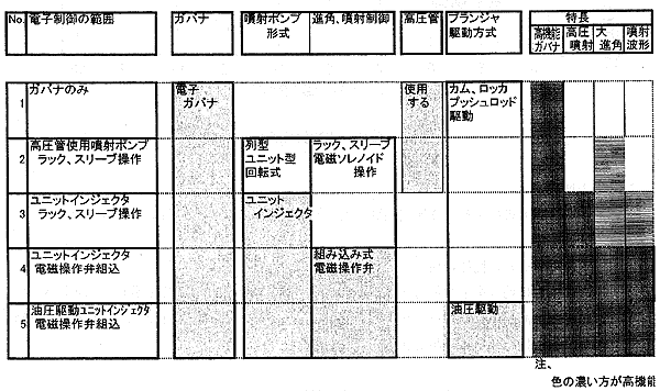 更に、必要な進角、高圧、望ましい噴射パターンを得るには、同じ電子制御でも、ユニットインジェクタ式が高圧化に有利で、さらに、電磁制御弁組込ユニットインジェクタは、噴射制御の可動部の慣性が少なく、追従性に優れているため、噴射ポンプのラック、スリーブを電磁ソレノイドで操作する方式よりも有利となる。