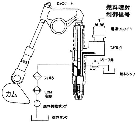 ECMより発信される制御信号は、ユニットインジェクタに組み込まれた、150-200MPa(機種により多少異なる)の燃料制御弁を100V程度の電磁ソレノイドで操作し、最適燃料噴射パターンと噴射時期を実現する。
