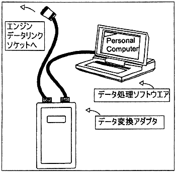 ETは図10に示すような構成となっており、このサービスツールの中心となるデータ処理ソフトは、ウインドウズ95搭載のパソコンにインストールし、データ変換アダプタを介してエンジンに接続し、ECMと通信することにより、ユーザパラメータ(アイドル回転数など)の設定や、各種保守サービスに活用する。