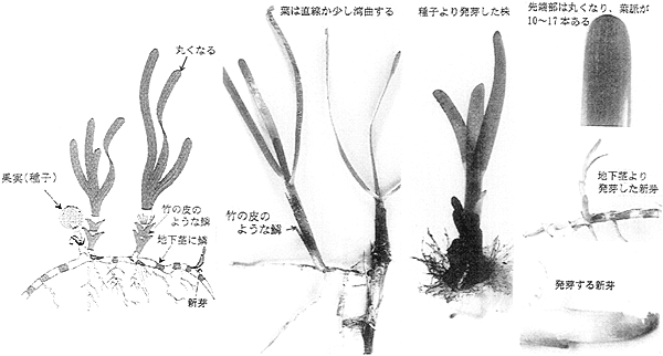 特徴:葉は細長いがやや幅広く、根元に竹の皮のような鱗がある。葉脈は10〜17本あり、直線か少し湾曲して先端部が丸くなる。また、先端をよく観察すると細かなぎざぎざがあるのがわかる。地下茎は、円柱状で太さは3〜5mmで竹の皮をつけたような筋がある。