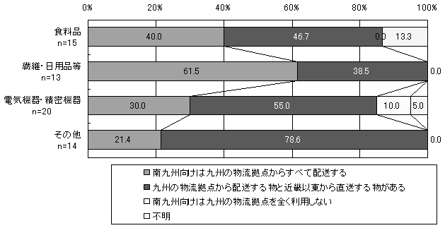 これを業種別にみると、繊維・日用品等においては、「南九州向けは九州の物流拠点からすべて配送する」が61.5%と最も多くなっている一方で、食料品、電気機器・精密機器においては、「九州の物流拠点から配送するものと近畿以東から直送するものがある」がそれぞれ46.7%、55.0%と最も多く、業種間で差異がみられる。特に電気機器・精密機器については、表5-1-6において「九州に物流拠点は全くない」とする割合が高いことからも、直送割合が相対的に高い業種であると考えられる。