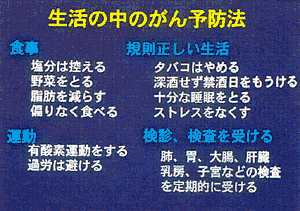 その内容ですけれども、たばこは吸わないということ、酒も飲みすぎない、食生活においても塩辛いものや不飽和物の摂取をさけ、偏食をしないようにし、緑黄色野菜等を多く摂ることが大切です。