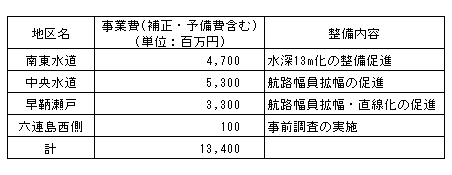 平成12年度に水深12mを完成し、平成17年度までに、北部九州諸港のコンテナターミナルの供用開始時期に合わせて、六連島西側地区の幅500m区間と他の全区間において、航路水深13mを確保する計画です。