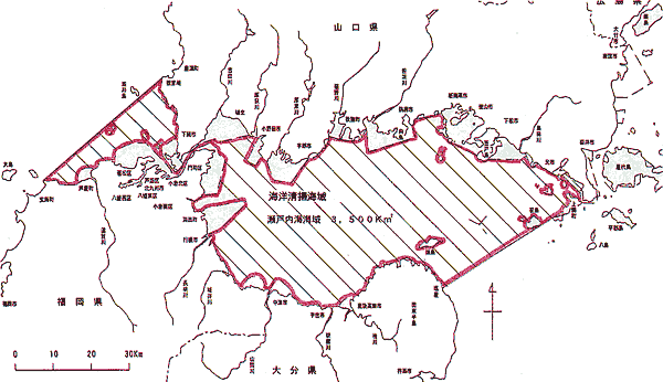 関門航路の整備事業の他に海洋環境整備事業として、街や沿岸部及び河川などから海洋に流れ込んできた浮遊する流木やゴミの回収、また海面を浮遊する油を回収するため、東は周防灘から西は響灘迄の約3500km2の範囲(下図参照)(港湾法の港湾区域及び漁港法の漁港区域は除く。)を、清掃船「こうのしま」と油回収船「ひめしま」の2隻で実施してきましたが、老朽化のため平成12年4月に清掃兼油回収船「がんりゅう」を新造して、清掃作業を実施しています。