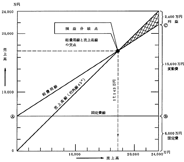 売上高24,000万円、変動費15,600万円、固定費6,000万円がわかれば、方眼紙(A-4の大きさ)に適当な目盛りで(この例では1,000万円を5mmとした)横軸と縦軸に売上高をとり、正方形をつくる。0点から対角線(45°)を引く。この対角線が「売上高線」となる。 次に固定費(6,000万円)を縦軸の目盛にとり、売上高0〜24,000万円まで一定ですから、横軸に平行線を引きます。A-Bが固定費線となる。