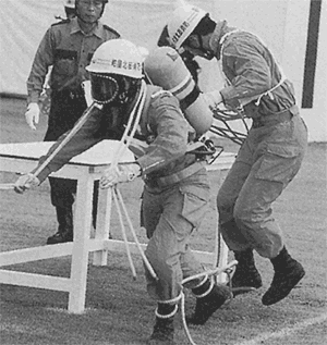 垂下されたロープを、手だけを使って一五メートル登はんする。壁面を蹴ったり、足にロープを巻き付けることなく、登はんしなければならない。