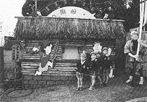 当署小川出張所では、小平の開拓に威力を発揮した水車による広報板を作成した。 これは、火災予防と書かれた水車が廻ると、両側の人形がバケツで真ん中の火を消すもの。所員が知識や技術を結集し作成した。夜間も照明に映えて、路行く人々も、ユニークな人形と廻る水車に熱心に見入っていた。