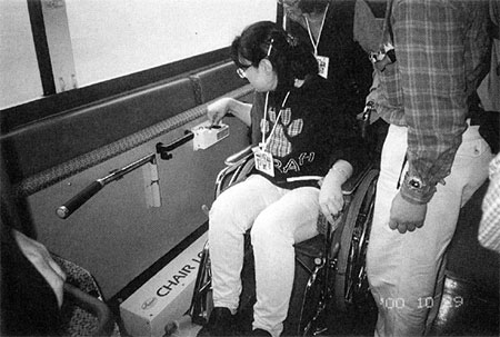 実際にノンステップバスに乗り、車椅子の固定の方法を体験する。