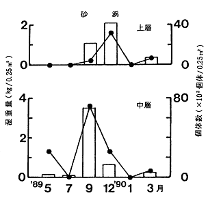 また、有山ら(1993)1は同じ試料を用いて、砂浜に出現した主要種について出現状況の季節変化を整理している。その結果、上層における主要種はヒメスナホリムシ、中層ではニホンスナモグリであり、両種とも9〜12月に多く出現したことを報告している。