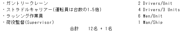 主要コンテナ航路の大型船の場合、契約条項にはないが紳士協定として使用するガントリークレーンの台数には関係なく、1時間当たり70コンテナの能率を約束しており通常3〜4台のガントリクレーンを張り付けている。