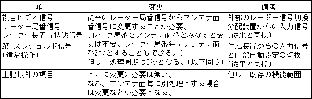 新方式レーダーのレーダー系インターフェースの検討では、増設が必要となる機能として、アンテナの識別とアンテナ別のスレッショルドレベル個別制御及び相互に連携制御して追尾できる機能について検討が必要となる。既存レーダーのレーダー系インターフェースから変更が必要となる個所について、海上交通情報機構レーダ映像量子化装置仕様書(関門海峡)を例にとって次に示す。