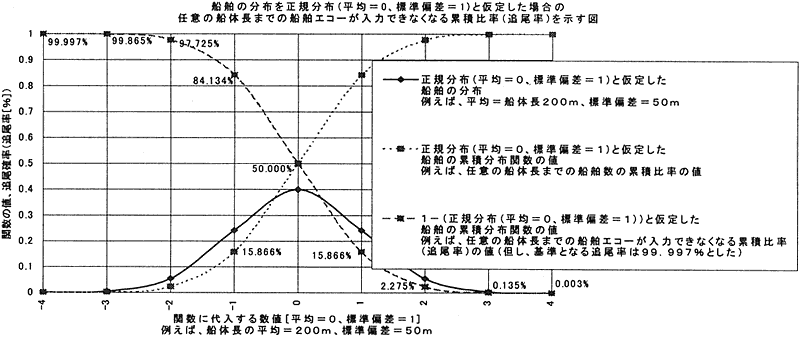 3) 東京湾における船舶の分布を、実際に調査して把握することは極めて困難であるが、前項で仮定した例えば正規分布と考えることは可能である。また、そのレーダー観測による船舶エコーの入力状況を実際に得ることも可能である。しかし、レーダー観測による船舶エコーの入力状況では、レーダー局からの距離とその船舶の大きさに逆比例して入力できる船舶エコー数は減少することになり、遠距離の小さい船舶から実際に入力できる船舶エコー数としては減少するのが通常である。そこで、正規分布と仮定した船舶の分布とそのレーダー観測による船舶エコーの入力状況を想定し徐々に悪化する追尾率との関係を試算した図を図4.6.2に示す。