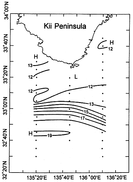 Fortunately, we conducted CTD observations along three north-south lines in Cruise I which are long enough to detect the position of the Kuroshio axis. The observation sites and the horizontal temperature distribution at the depth of 200 m are shown in Fig.16. A typical temperature distribution at a depth of 200 m at the time of the Kuroshio straight path is shown in Fig.1. This distribution is taken from the observations conducted on board the R/V Seisui-maru and the R/V Wakayama on June 11-14, 1996. The isotherms of 15℃and 16℃ run almost in the west-east direction in both Fig.16 and Fig.1, but the position of the Kuroshio axis is quite different in each case. A sharp Kuroshio front hits Cape Shionomisaki in June 1996, while a rather wide coastal zone can be seen between Cape Shionomisaki and the Kuroshio axis in October, 1996 (Cruise I). The position of the Kuroshio axis (15℃) measured southward from Cape Shionomisaki was about 50 km in October, 1996, and corresponds to the distance at the time of the Kuroshio Large Meander. Though the east-west scale of the eddy cannot be determined from the limited observation, the temporary departure of the Kuroshio axis from the coast occurred at the time of Cruise I.