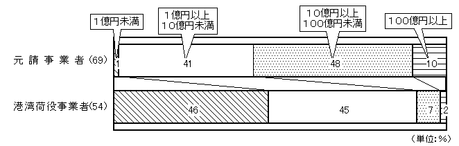 4] 港湾運送事業の売上高 最近1年間の港湾運送事業の売上高を見ると、荷役事業者は「10億円未満」が91%を占めており、10億円以上の事業者は9%と少ないが、元請では「10億円以上」が58%を占めている(図3-11.)。