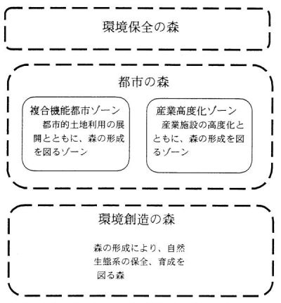 もちと一体的に結びついて、自然との触れあいや人々の交流・活動の場を提供するとともに、良好な都市環境や景観を創出するための森 |