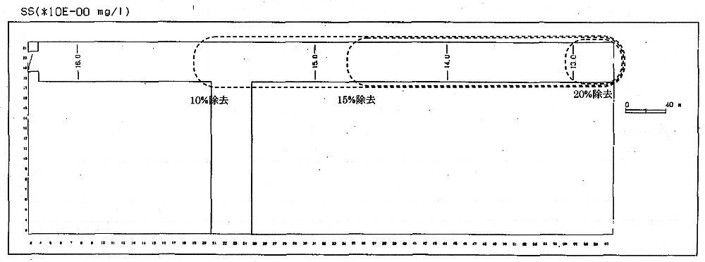 北堀運河におけるSSは、ケース1のシステムを適用しない場合(現況)、30日目(7月末)において、16〜18mg/l、60日目(8月末)において16〜18mg/l、90日目(9月末)において14〜15mg/lである。