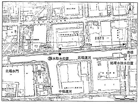 システムの配置は、本体を護岸沿いに設置し、原水の取水位置を港橋から約350mの位置に設定し、処理水の放水位置を港橋付近に設定する。