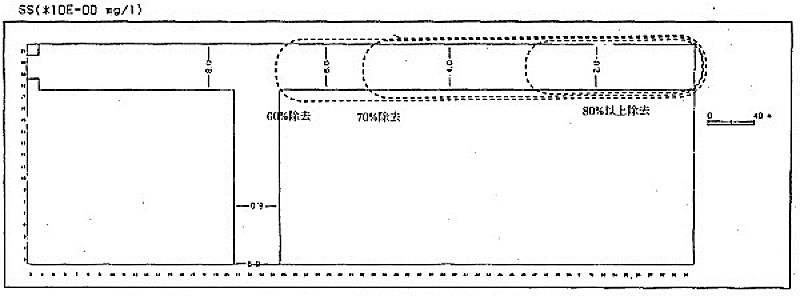 以上のように設定したシステムを稼働させることにより、前述した水質シミュレーション計算結果から、現状のSSの濃度を港橋から150mの範囲で約80%以上、150〜280mの範囲で約70〜80%、280〜350mの範囲で約60〜70%除去できるものと予測される。(図5-6)