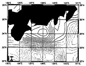 Fig.10 Distribution of SSDH in Sagami bay and around Izu islands when a warm eddy was observed in March 2000 in the Enshu-nada sea along the Pacific coast of central Japan. (from CCAR's WWW)