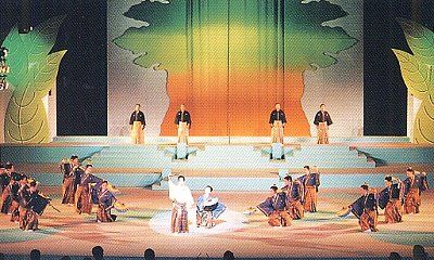 「貧交行」(杜甫作)を吟じる辻島鑑霊、八代輝霊両氏と、これを舞う山本兼正氏とその社中の皆さん