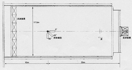 実験は規則波及び不規則波を各波方向(0°、45。、90°)にて浮体に作用させ、浮体の運動、加速度、ヨーク及びばねの係留力等を計測した。実験水槽には三菱重工業(株)長崎研究所の浅水域水槽(L×B=40m×17.5m)を使用し、供試模型の縮率は水槽の造波能力及び計測精度等を考慮して1/20とした。図2.1に水槽内での模型配置状況を示す。