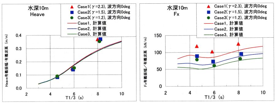 各実験結果は波高で正規化した応答を波周期ベースの図にして表し、各パラメータ影響を比較した。その結果を計算値と比較して以下に示す。各図で、規則波中及び不規則波中の結果を上下に並べて示している。