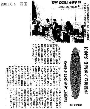 *8月19日には、同県大川郡大内町において、大川郡教育相談研究会主催による講演及びシンポジウム「不登校シンポジウムin大川」が開かれた。シンポジウムは「不登校を語ろう」と題して行われ、大学教授・県教育委員会の相談員・小学校教諭・不登校体験者の親とともに、相談ボランティアも2名参加し、活発な意見交換がなされた。