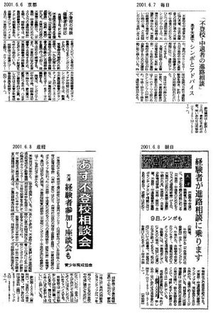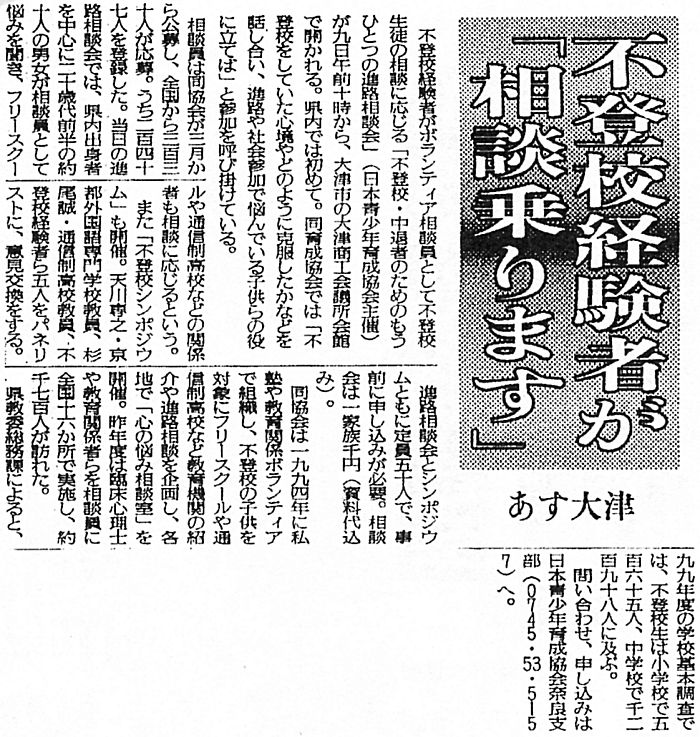 滋賀県という場所がら余り多くの来場者は望めなかったが、開けてみるとかなりの人が集まり盛況であった。大津市青少年対策課の方も参加し、不登校経験者の相談ボランティアとはいかなる人達かもご理解頂いた。こちらの新聞にも「ひきこもりからの社会参加」というような内容が載っていたので、職業紹介をしてくれると思ってきた人もいた。大宮と同様の対応で十分な説明と相談に乗ったが、メディアはどうしても目を引くような見出しをつけるのでプレスリリースには十分気をつけなければならない。 |