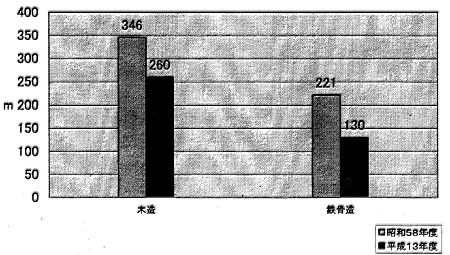 現在の「こみせ」の屋根はすべて柾葺から鉄板葺あるいは柾葺の鉄板覆いに改められており、「こみせ」の路面もほとんどがコンクリート叩きになっている。「こみせ」本来の構造は木造であるが、アーケード化したものなど、伝統的形態のくずれた「こみせ」のなかで鉄骨造は130m(33%)を占めている。なお、伝統的形態を維持している「こみせ」は幅が1.6m前後、軒高は2.3m、屋根勾配は2.0寸勾配前後で、天井は垂木表しである(図3-19,22)。