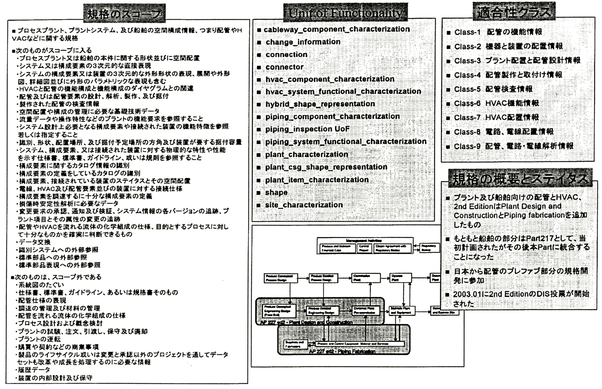先に開かれたワークショップでは、これらShip Mechanical Systemsの要件を満たす為には現存のAP227に、新たに3個の機能単位を追加することで、達成できるという見込みが報告されているが、以上の様に考えてくると、Ship Mechanical Systemsの全ての機能を組み込むのは、かなり難解な作業を伴うのではないかと思われる。本件については、現在鋭意作業中であり、近い内にその結果が公表されるであろう。なお、主な機能である舶用機器の表現には、旧来AP226で取上げられてきたISO 13584 Parts Library(通称PLiB)によるものから、ISO 10303-221やISO 15926(Oil and Gas)で使われているReference Data Library(通称RDF)によるものへ置換される方向にある。ただ米国は、PLiBを範疇にいれており、双方を使える仕組みを求められるものと判断される。