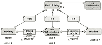 図5.3の各々の箱は、単数のthingまたは複数のthingとして解釈されることに注意のこと。例えば、もし'anything'が複数のものに対するポインターであれば、そのクラスの関係は複数の各要素毎のクラスになる。さらに、'kind of things'は、3個のクラスに対してkind of anything、つまりkind of roleとkind of relationをそれぞれ表わすので、'kind of thing'になる。