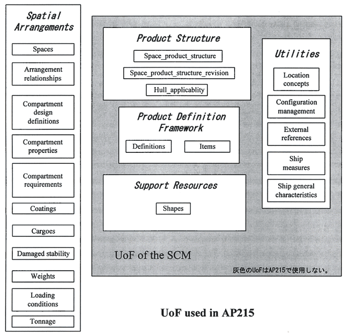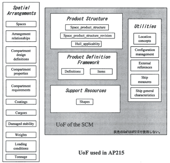 このAP内で規定されるUoFsは2つのカテゴリーに分かれる。1つはShipAP間で共通なShip Common Model(SCM)であり、他の1つは、本AP特有の部分を記述する空間配置(Spatial Arrangements)である。図5−1を示す。