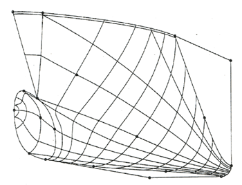 典型的なship_moulded_form_wireframe_modelはstation curveとwaterlineのリストによって形成できる。 |