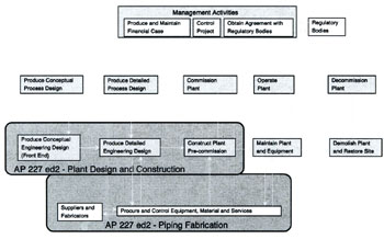 図2はプロセスプラントの基本ライフサイクルを表している。“AP227ed2”とラベルのついた長方形で囲まれている範囲がAP227で有効なプラントライフサイクルである。