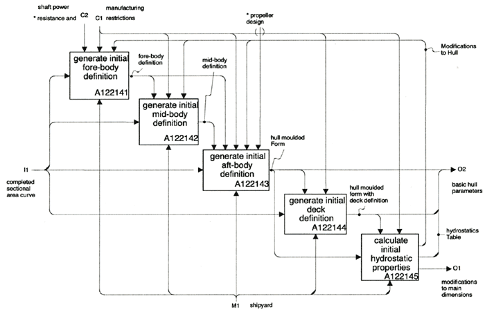 DISのドキュメントには前述の全Activityに対して、IDEF0表記法を用いて記述されているが、ここではA1221 create preliminary hull form(初期船体形状生成)のActivityに適用したものを1例として下図に示す。これにより初期船体形状生成の全体の活動が理解されやすくなっている。