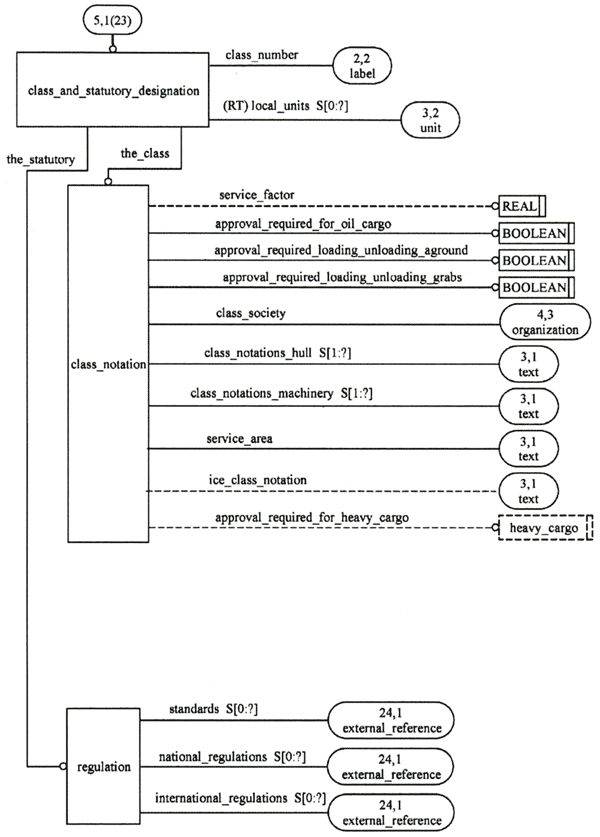 Class_and_statutory_designationはGeneral_characteristics_definition(DIS−4.2.40参照)の一つで、船級協会による、船の設計・製造・修理の承認の目的で、船(DIS−4.2.88参照)に与えられる識別について詳述する。Class_and_statutory_designationと関連するデータは、以下の通りである。