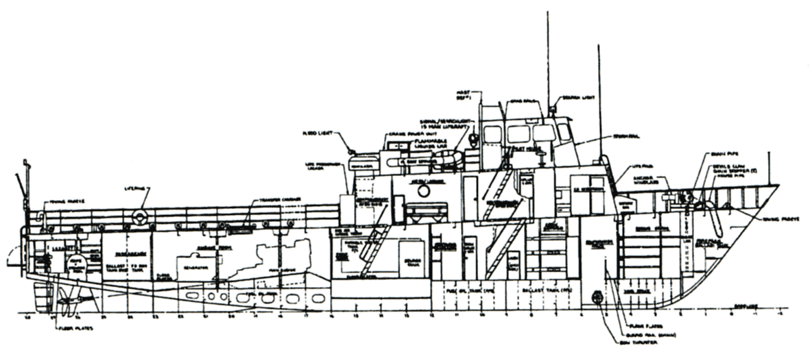 TWRはUSAの空軍に配備され、ミサイル軌道の修正に使用されている。またデッキカーゴには20 long tonの輸送能力が備えられ、最大42 long tonの搭載能力を持つ(フルリキッド、フル搭載の状態で)。図8.3-1,2にTWRの船外及び船内側面図を、図8.3-3にデッキとホールドの一般配置図を示す。