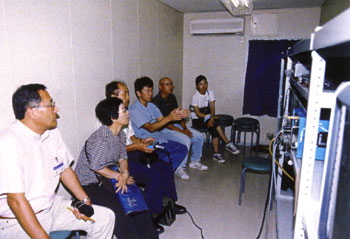 「圧力体験実験」 加圧された潜水シミュレータの中では、テニスボールもビンの中に