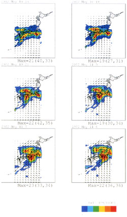 検証は従来の浅い対流のwarm rainスキームと、深い対流のcold rainスキームを比較することによって行った。(実験1〜実験2)深い対流の計算は鉛直層の最上層を9000mとした。また、上空は風速が強くなるためタイムスチップを30秒から20秒に短縮した。その他の条件はすべて統一した。