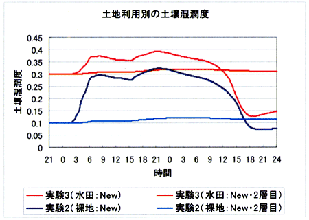 図3.2.20に土地利用を水田とした場合と裸地とした場合の比較図を示す。水田は初期の土壌水分量が大きいが、降雨による増加量は少なかった。太陽放射による乾燥の時間帯はほぼ同程度乾燥した。太陽放射が弱くなって土壌湿潤度が回復する時間帯は水田の方が回復速度は速かった。