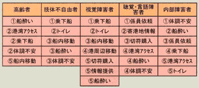 具体的に船で考えていく場合に、どうしたらいいかということですが、特に小型船のところで触れたように、船はバリアフリー化が重要であるにもかかわらず、技術的に非常に難しいわけで、利用者の身体障害者団体の方からも調査の中でお話があったのですが、船とか港全部をバリアフリー化するというのは理想ではあるけれども、ある一部の区切られた部分でもいいから優先度の高いもの、あるいは出来るものからやってほしい。例えば、車椅子の方、目の見えない方が船の隅から隅まで行けなくても、ちゃんと乗れる場所が確保され、あるいはトイレぐらいは一人で行けるというレベルまで行うなど、ターゲットを絞って進めるのが大事だろうということです。